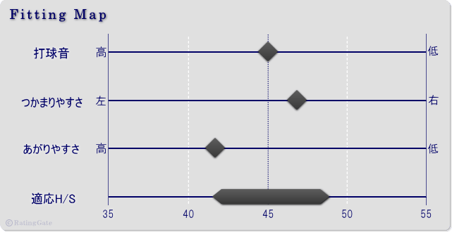 またどちらかというと右に飛び出しやすい。重心深度も長め。方向性も良くスイートスポットも広い半面、打感と打球音にはあまり気を使ってない。