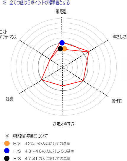 適正ヘッドスピードとしては42〜45m/sだが、重めのクラブ重量や回転数の多いヘッド特性を考慮に入れると、バランスが良いとは言えない。