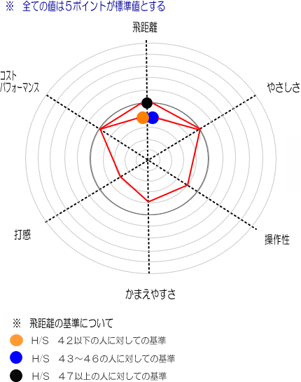 低反発のわりに球離れは速いほうなので、操作性は犠牲になっている。シャフトもヘッドが走るので、自分でコントロールはしづらい。ただ初心者にはそのほうが簡単に感じるかもしれない。フェースプログレッションが大きく、フェースが前に出ているように感じる為、手首を使用してフェースの向きをコントロールするのは難しい。
